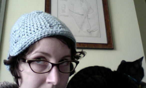 Last week, I took a break from social media and used the time for more productive pursuits. For example, Exhibit A above, my first crocheted hat. (That’s Sugar next to me, expressing her usual enthusiasm.) It was so easy, I moved on to Exhibits B and C.