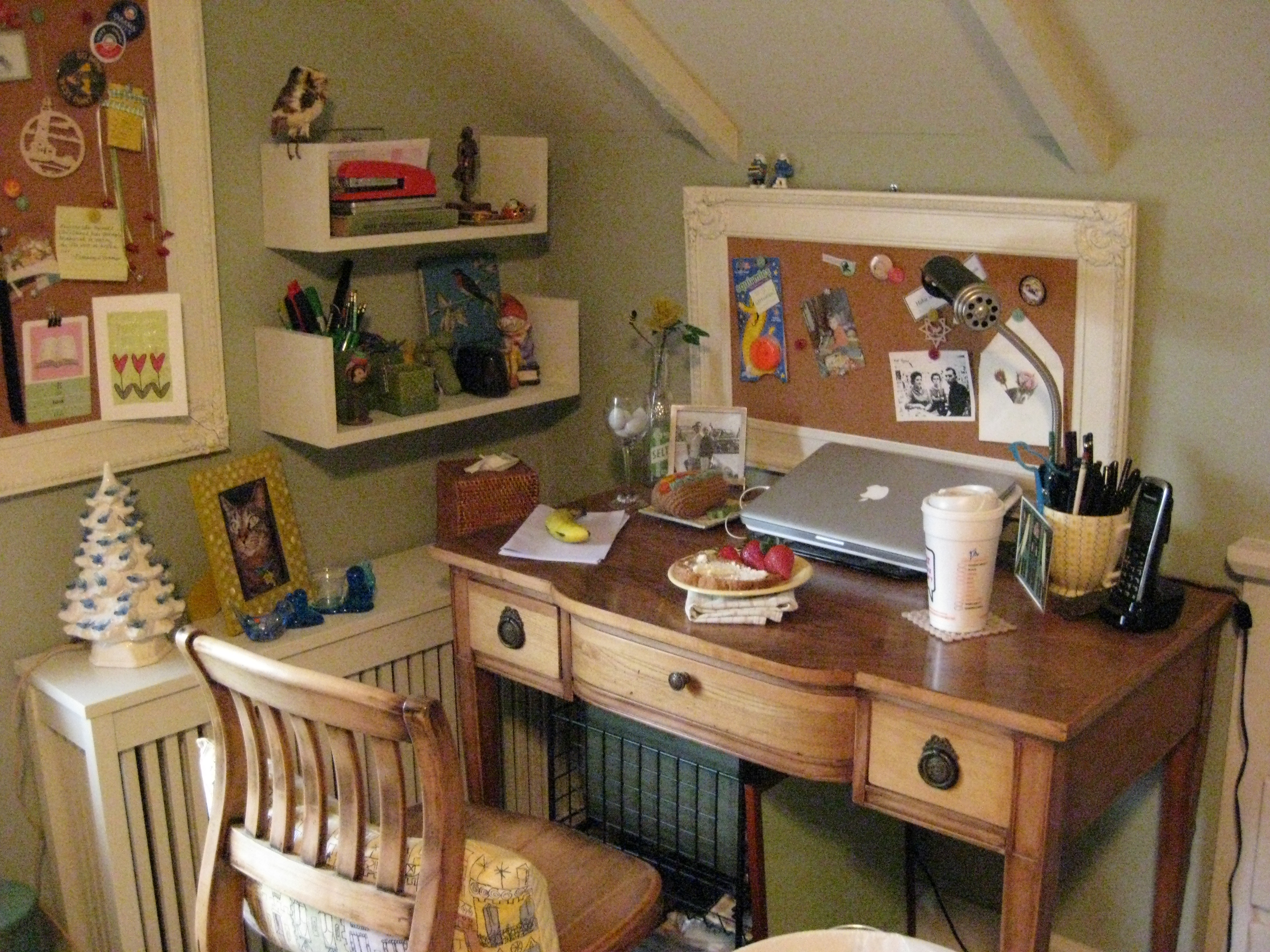 Hello! Thought I’d end the week with a reveal of my newly-rearranged workspace. As you can see, I’m just about to eat my breakfast — toasted homemade bread with honey and ricotta, with fresh strawberries…and a huge Dunkin Donuts coffee. Can you tell I live in Rhode Island? The desk was someone’s old vanity table, saved from the trash and refurbished (as was the chair) by my sister. The cork boards, shelves, and radiator cover were all made by my husband. If you look closely, you can also see: a red Office Space stapler, a reading gnome figurine, a vintage Girl Scout trophy, and two Smurfs. I like a variety of stimuli around me when I’m working. Also, on the left, you can see the shrine I’ve set up to one of my kitties, Sugar (aka Shoogie).